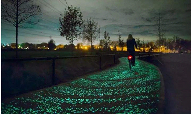 这条车道给你最大的惊喜,是每当夜幕降临,它能够发出盈盈亮光,其灵感正是来源于梵高的《星空》,这是世界上第一条夜光自行车道。路面铺设的石子表面涂有特殊涂料,它们白天吸收阳光的能量,黑夜之后慢慢发出蓝绿色光芒,让骑行其上的人仿如骑行在星空中,美得就像是走进了梵高的画里。这种骑行在繁星中,银河里的体验,恐怕是运动和诗意最美好的结合。