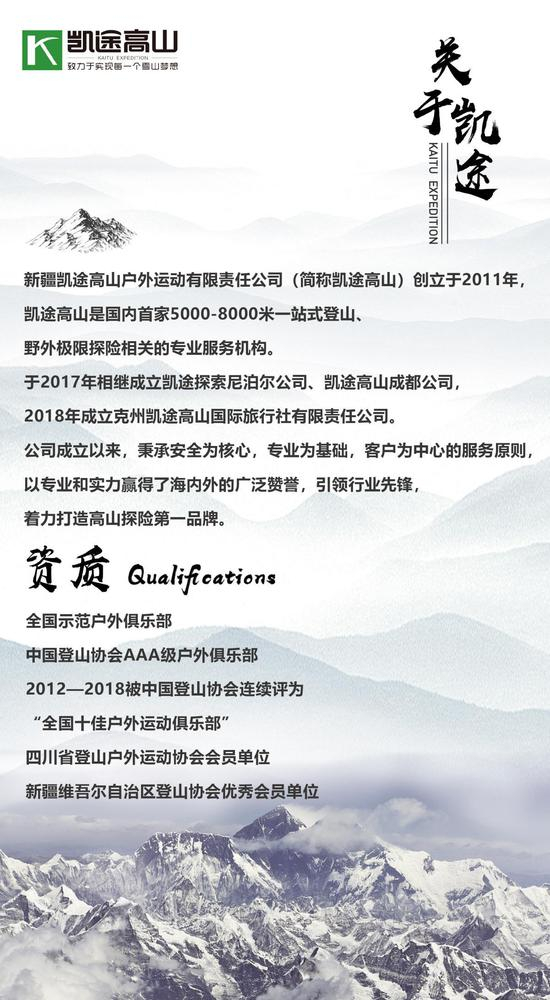 本期“凯岳女子登山队 征战8163米马纳斯鲁”活动由国内首家5000-8000米一站式登山专业服务机构凯途高山全程提供保障: