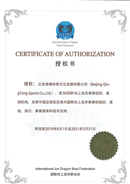 国际冰上龙舟联合会授权清腾体育成为冰上龙舟赛事组织、策划机构,负责中国区指定区域内国际冰上龙舟赛事的组织、策划、执行、赛事服务和技术支持。授权清腾体育在中国区冰雪运动进校园领域独家运营推广冰上龙舟运动。