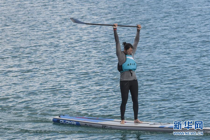 12月18日,北华大学选手邱丽潘在女子桨板竞速绕标环岛500米决赛中率先抵达终点后庆祝,她最终夺得该项目冠军。 当日,2019年第三届中国大学生桨板竞速挑战赛在海南万宁石梅湾开赛。来自全国13所高校的近百名选手在男子、女子桨板竞速绕标环岛500米和男子、女子桨板竞速绕标环岛3000米以及男女混合桨板竞速绕标环岛4X500米接力赛展开角逐。 新华社记者蒲晓旭摄