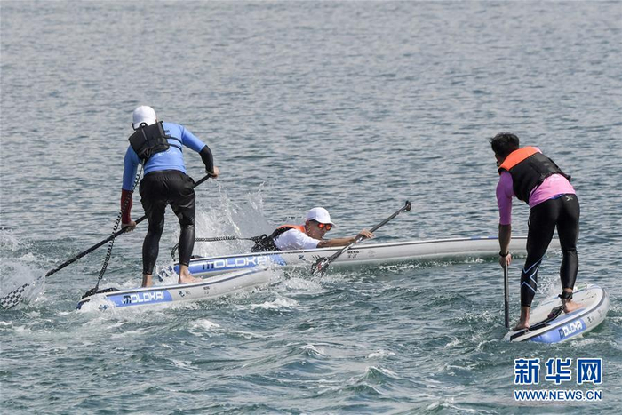 12月18日,男子桨板竞速绕标环岛500米半决赛中,西南医科大学选手康佳豪(中)不慎落水。 当日,2019年第三届中国大学生桨板竞速挑战赛在海南万宁石梅湾开赛。来自全国13所高校的近百名选手在男子、女子桨板竞速绕标环岛500米和男子、女子桨板竞速绕标环岛3000米以及男女混合桨板竞速绕标环岛4X500米接力赛展开角逐。 新华社记者蒲晓旭摄