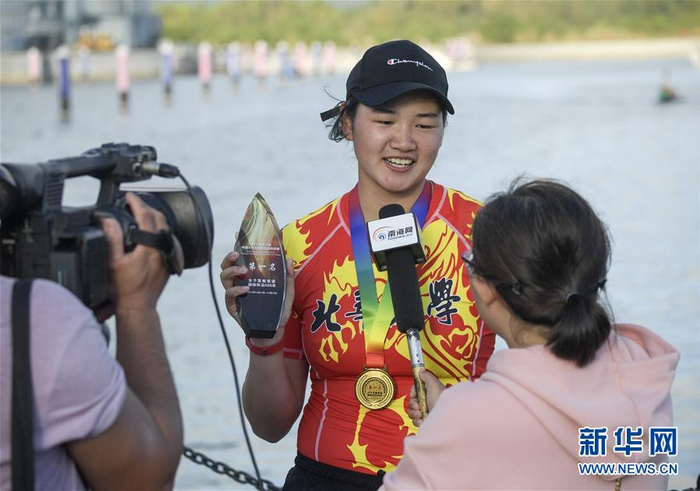 12月18日,北华大学选手邱丽潘在颁奖仪式后接受媒体采访。她在女子桨板竞速绕标环岛500米决赛中夺冠。 当日,2019年第三届中国大学生桨板竞速挑战赛在海南万宁石梅湾开赛。来自全国13所高校的近百名选手在男子、女子桨板竞速绕标环岛500米和男子、女子桨板竞速绕标环岛3000米以及男女混合桨板竞速绕标环岛4X500米接力赛展开角逐。 新华社记者蒲晓旭摄