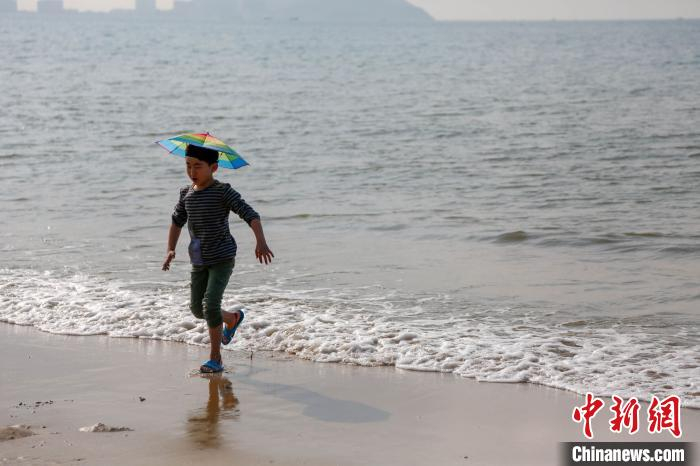 三亚湾沙滩上,一位小朋友头戴“伞帽”在嬉水。(资料图) 王晓斌 摄