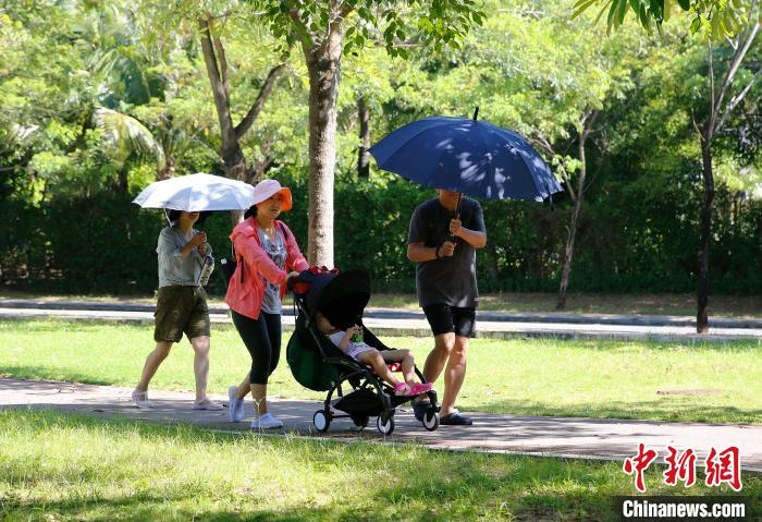 三亚湾岸边绿化带里,一家人从树荫下走过。(资料图) 王晓斌 摄