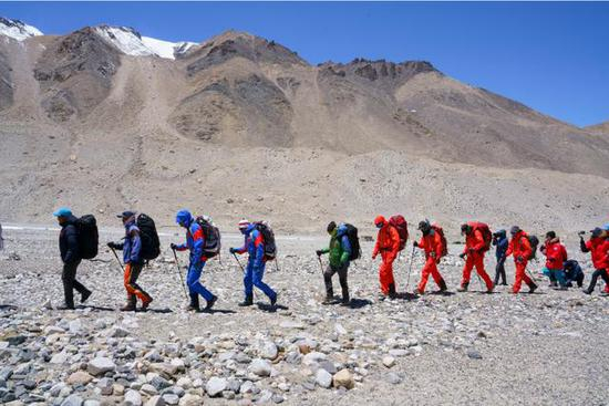 中国登山队于6日从海拔5200米的珠峰大本营出发,于当日18时左右抵达海拔5800米的过渡营地;7日上午11时,从过渡营地出发,沿途经过东绒布冰川,徒步约6小时后到达前进营地。