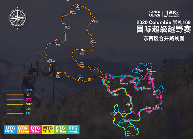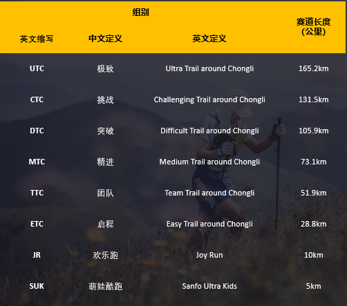 2020年新增的TTC组别(50公里团队赛),要求3人组队且团队中至少有1名女性选手,3名选手全部完赛方可获得团队成绩。 而新组别CTC(130公里),则是赛道团队以崇礼老城为中心在西部地区进行的全新设计,以往的赛道主要集中在雪场分布较多的东部山区,新组别,不仅在比赛在地域、文化上进行了扩充,同时130公里的距离也可以作为100公里选手晋级168公里之前的过渡组别。欢乐跑(10公里)则为一直在犹豫和观望越野跑运动的爱好者打开了一扇体验之门,通过较为轻松的赛制,让入门者能够从中收获与大自然亲密接触的乐趣,激发更大的户外运动热情。