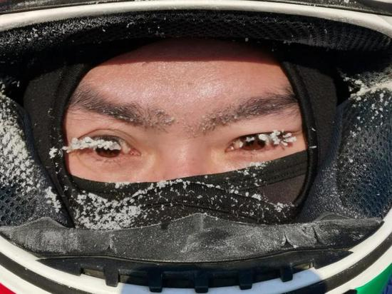 骑了一圈才知道,中国最冷的地方可不是漠河,而是最冷可到零下58度的内蒙古根河,如果不戴手套不到1分钟手就会整个僵住。为了保暖,我身上穿满了电子加热的手套、羽绒背心、袜子,相当臃肿。每次骑完车脸基本会冻成红黑色,眉毛、睫毛和霜结在一起,嘴巴僵硬到跟人说话都会有障碍。头盔之前还摔了一道缝,虽然里面脑袋裹得很严实,但脸还是被这道缝里钻进来的风冻伤了,又肿又痒。