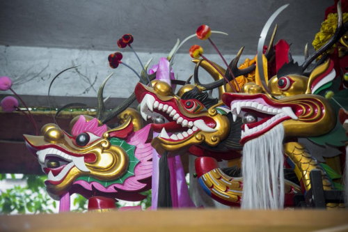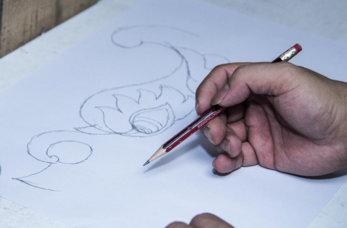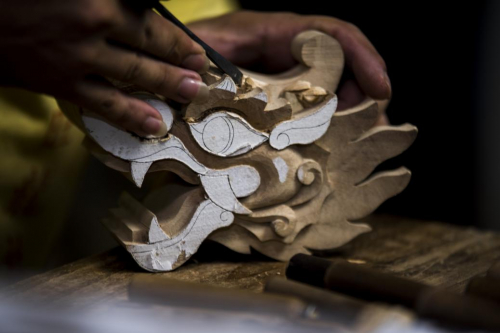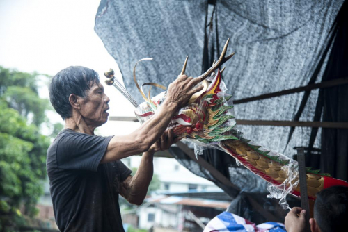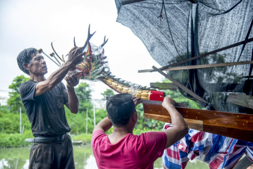 “画虎先画骨”,俯在案上,老李的儿子帮助老李用简单的线条勾勒龙首模样,画笔在纸稿上飞舞。之后的日子里,选材、割板、打龙骨,经老李的手,木桩上浮现出江龙的头尾与四肢……短短的几个字无法言尽成百上千次的雕琢,精打细磨,刻木成舟……几十个日夜过去,开眼上色,择选良日,龙舟才能入河。这份世代传承下来的手艺烘托出的是传统技艺所呈现的不凡智慧。