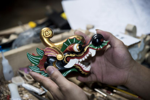 龙的神韵、配色、神态都在龙头,这就要在图纸上下功夫,梁贤明仅画图就学了一年。“纯手工制作是最能体现传统龙舟神韵的。”