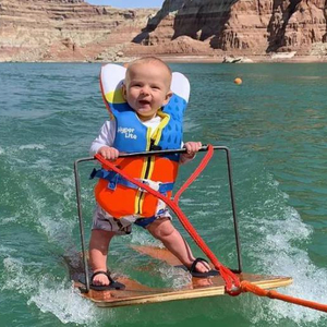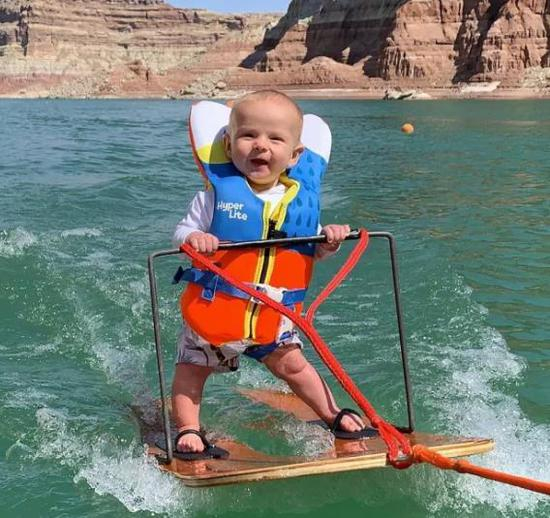Rich Humphreys仅6个月零4天,他由父母带着在美国犹他州南部的鲍威尔湖上进行滑水。小家伙穿着救生衣站在滑水板上,他的脚安全地绑在木板上,双手扶着板上的金属杆,木板系在船上被慢慢拉动。他的爸爸Casey在另一艘船上和Rich一起前行,保护着他。