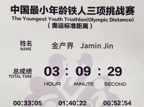 九月初,阳光依然灿烂,炎热潮湿的天气使人们不得不呆在室内。然而,在灿烂的阳光下,12岁男孩3小时完成铁人三项。男孩金产界(豆豆)凭借刻苦的训练和惊人的耐力,在上海青浦区市淀山湖完成了中国最低年龄铁人三项挑战赛(奥林匹克标准距离),耗时3小时09分29秒,并获得上海铁人三项协会颁发的结业证书。