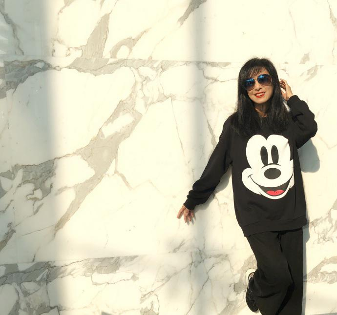 别说在保养这一块香港的女明星还真是不错的,尤其是头发的保养,像李若彤、袁咏仪这些人的头发乌黑发亮的,而且还浓密,完全没有脱发的烦恼。米雪也是如此,宽松的黑色卡通卫衣配黑色阔腿裤,红唇乌黑长发,戴上这墨镜,是不是看不出是奶奶辈的人。