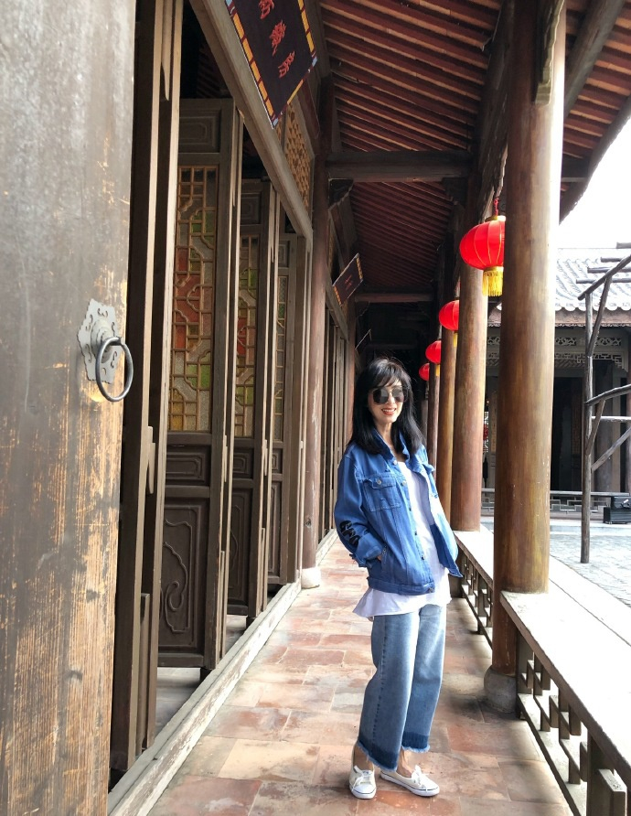 出门旅游的米雪看起来就更年轻了,年轻的穿搭会让人看起来更年轻,所以不要到了这个年纪就想着奶奶装。米雪这白色的长T恤搭配阔腿牛仔裤,可能米雪也了解到自己的腿型不好看,所以穿的阔腿裤,上半身搭配牛仔外套,个性又大方,这乌黑的长发为减龄增添了几分助力。