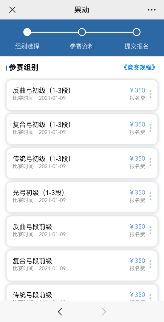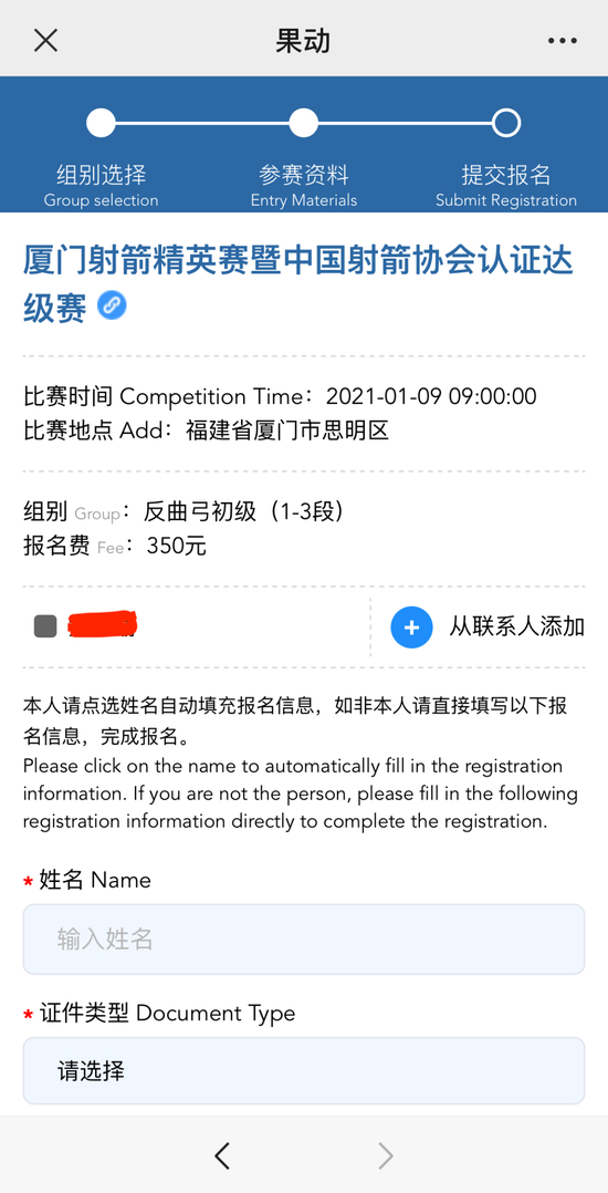 ②/选择参赛的弓种项目及对应段位,并填写个人信息;