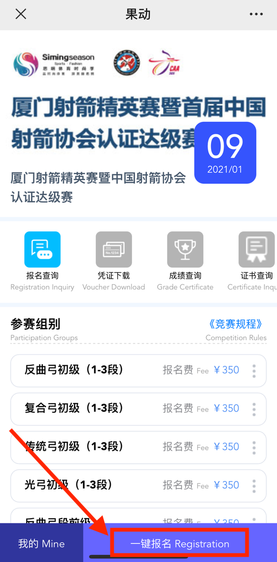 厦门射箭精英赛暨中国射箭协会首届认证达级赛报名已正式开启,将于2021年1月9日、10日开展赛程本次赛事首次面向大众开放参赛不设门槛,是国内级别最高的、唯一的首个射箭类“认证达级赛事”,赛事总规模限报400人,关注[果动赛事助手]进行报名,名额先到先得,报满即止!你还在等什么,赶快来报名吧!