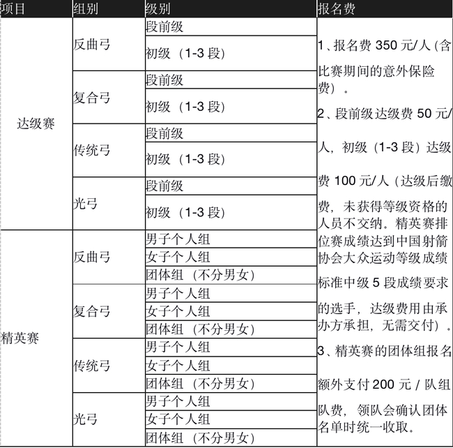 ● 每名运动员只可参加一个弓种项目及对应段位的比赛,禁止跨弓种、段位兼项;