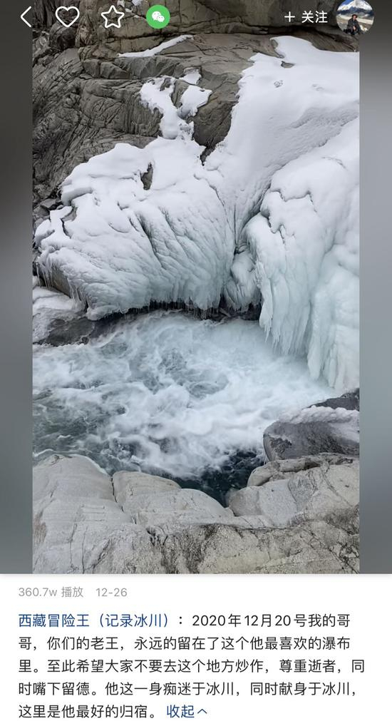 20日清晨,在一条曾经去过许多次的冰瀑,他不慎落水。羽绒服积水变沉,几番挣扎后,王相军体力不支。同伴将一个桶扔给他扶着,随后去找救援,可回来时,人和桶都已无迹可寻。寻找多日未果后,王相军的弟弟在他的短视频账号上向将近160万关注者告知了噩耗。