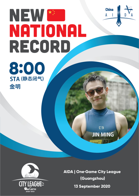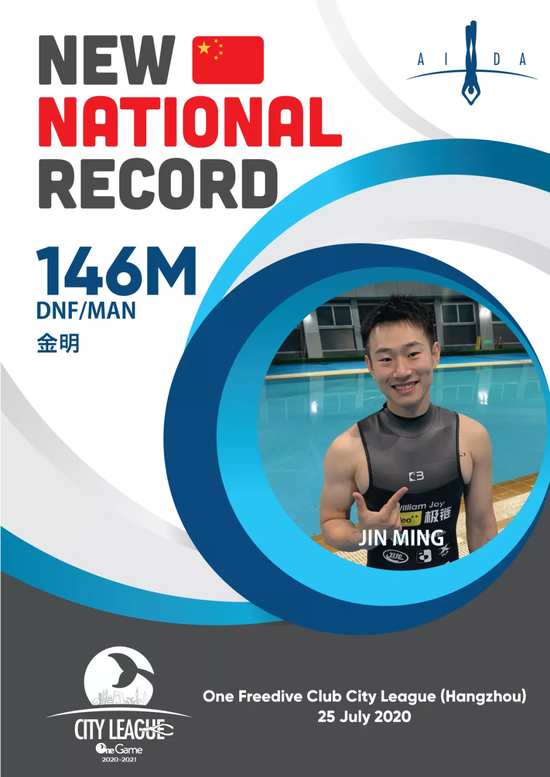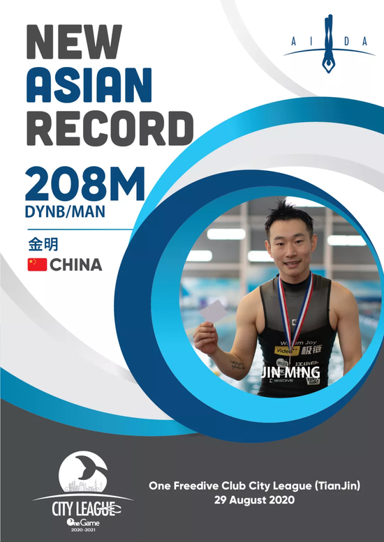 One意潜城市联赛2021赛季第一场比赛“上海冠军杯”于2021年1月15日在上海圆满收官,金明在本次上海冠军杯比赛中取得傲人的成绩。第一次打破单蹼国家纪录和亚洲纪录,他将原国家纪录208米,原亚洲纪录227米,提升到惊人的260米,成绩认证白牌有效。