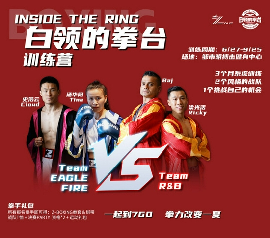 《白领的拳台》(Inside the Ring)训练营是通过3个月的系统训练,让拳击初学者和爱好者都可以在学习的过程中不断挑战自己,超越极限。结营后部分学员将通过选拔,最终登上实战对抗的擂台。