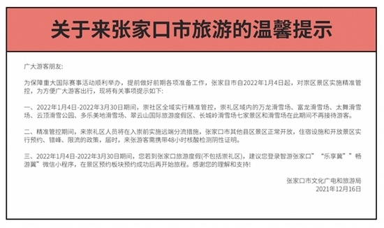 北京冬奥会开幕临近,作为比赛场地之一的崇礼进入全面准备阶段。近日,文旅张家口发布提示,崇礼区内7家滑雪场将于2022年1月4日-3月30日暂停接待游客,保障冬奥会的顺利举办。