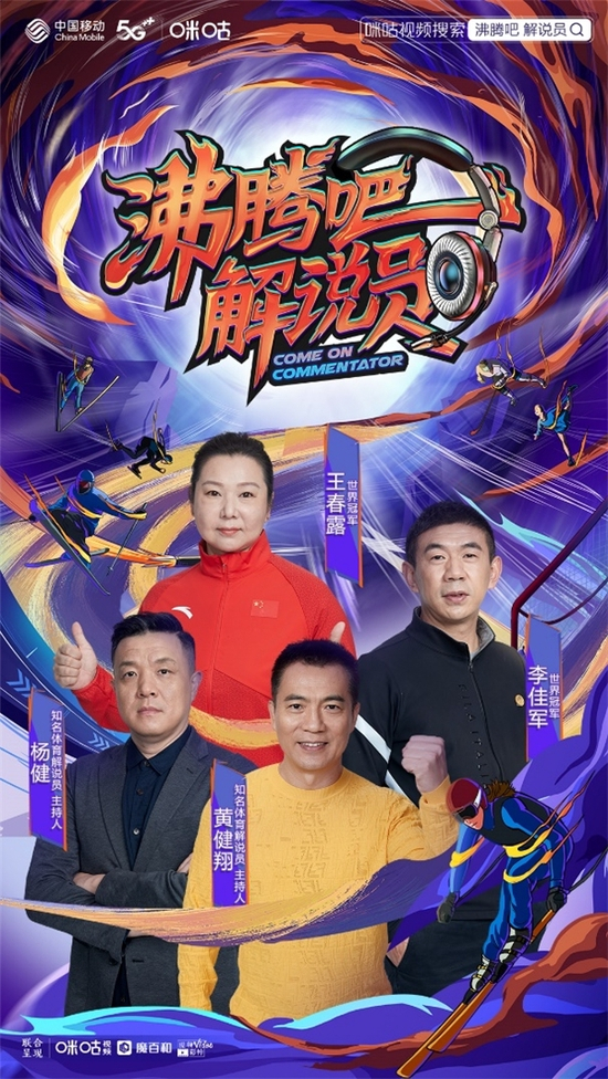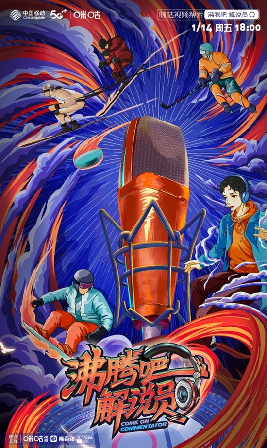 1月11日,由中国移动咪咕独家打造的体育解说选拔综艺《沸腾吧!解说员》在咪咕视频首播上线。节目集结了中国传媒大学和上海体育学院有志体育解说的高校学生同场竞技,由著名体育评论员杨健、体育名嘴黄健翔两位大咖担任评委,同时还邀请来了李佳军、王春露两位冰雪世界冠军坐镇评委台。中国移动咪咕作为2022北京冬奥会官方持权转播商、国家体育总局冬季运动管理中心的战略合作伙伴,旨在通过这档选拔节目为中国冰雪解说储备新生力量,向大众普及冰雪知识,与观众共同见证优秀体育解说员的成长过程。