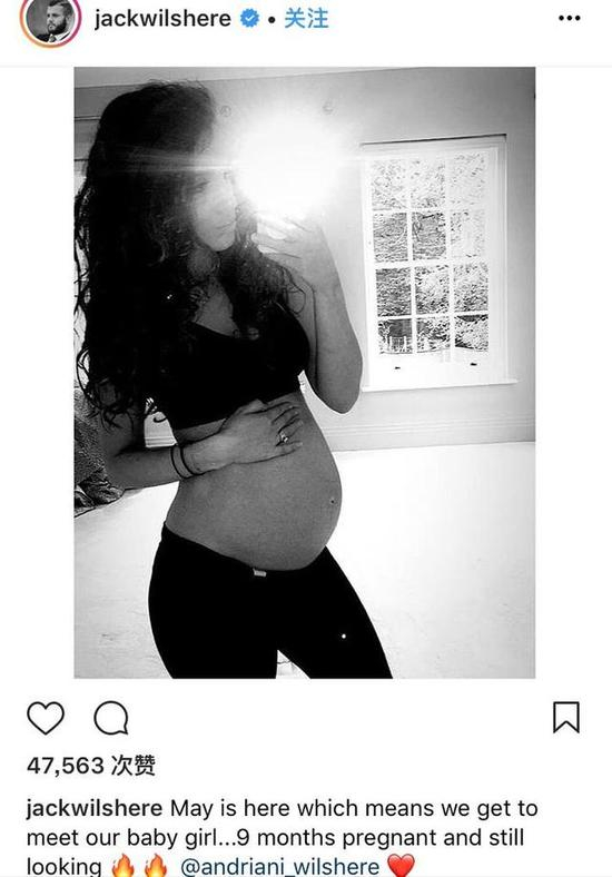 当地时间5月2号下午,威尔希尔在ins上晒出了妻子安德里亚尼怀孕9个月的照片,两人即将迎来属于他们的第一个孩子。
