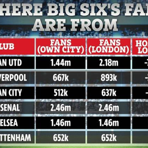 而英超六强中三支来自伦敦的球队,阿森纳在本市的粉丝是最多的,枪手拥有246万球迷,切尔西在伦敦则有146万球迷,热刺拥有65.2万。
