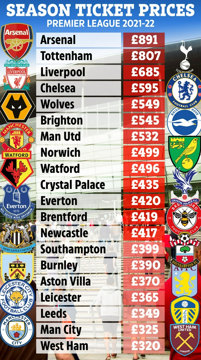 英国媒体《太阳报》统计了新赛季英超各队的平均季票价格,阿森纳以891英镑高居榜首。