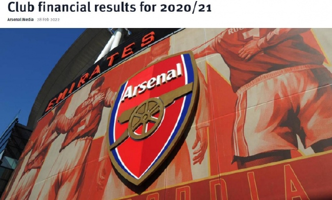 阿森纳上赛季财报:税后亏损1亿英镑 工资2.4亿镑