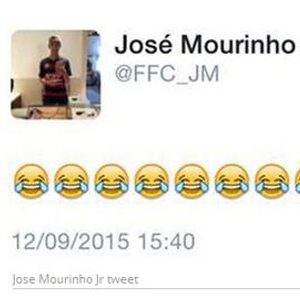 切尔西[微博][微博]战绩不佳,主教练穆里尼奥心情可想而知,此时,他的儿子又出来“添乱”。在切尔西输球当天,小穆里尼奥在比赛中发出了一组表情,引发了争议。