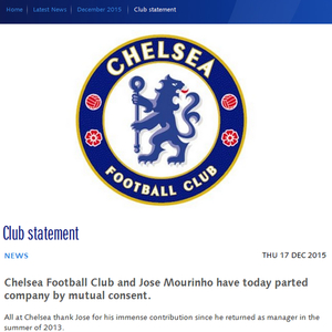 切尔西官网截屏 正式宣布穆里尼奥下课