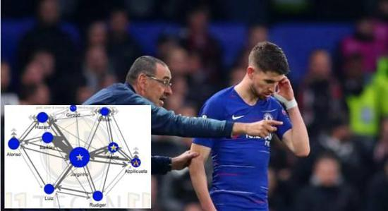 上图左下角是上赛季初段切尔西的比赛传球示意图,我们可以清晰地看到,处于后腰位置的若日尼奥是球队的球权掌控者,他给每一位队友都送出了传递,但是向前传球的比例并不多。