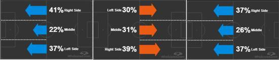 图:本赛季对阵利物浦、布莱顿、南安普顿三场比赛切尔西的进攻比例图
