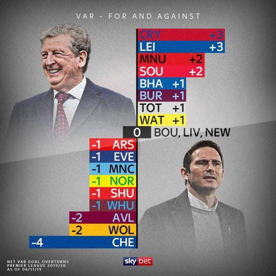 直播吧11月8日讯 《天空体育》统计了英超20队通过VAR净获利次数,水晶宫和莱斯特城净获利最多,达到了3球;切尔西则被VAR净获利最少,为-4球。