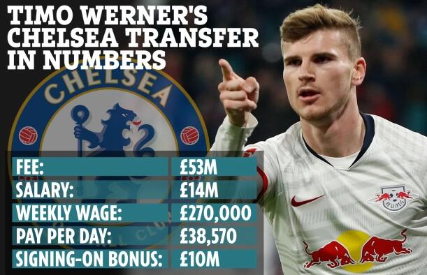 切尔西将在今年夏天签下维尔纳,转会费5300万英镑。球员的年薪将达到1400万英镑,相当于27万英镑周薪、日薪约合38570英镑。另外,维尔纳个人还会拿到1千万英镑的签字费。