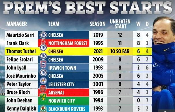 图赫尔至今已经10场不败了(6胜4平),距离英超历史上的不败开局纪录只差2场,之前的纪录是蓝军前主帅萨里保持的,12战8胜4平。