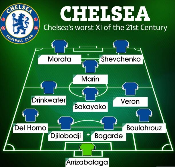 英报评切尔西21世纪最差11人阵容:舍瓦领衔442