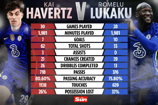 总的来说,数据表明在对阵里尔的比赛中,图赫尔放弃卢卡库是正确的,尽管哈弗茨的7粒进球看起来也算不上优秀。