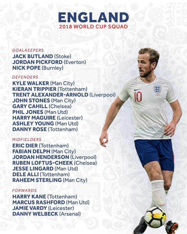 北京时间5月16日,英格兰足球代表队公布了参加俄罗斯世界杯的23人大名单,哈里-凯恩领衔,威尔希尔、乔哈特未能入选大名单。