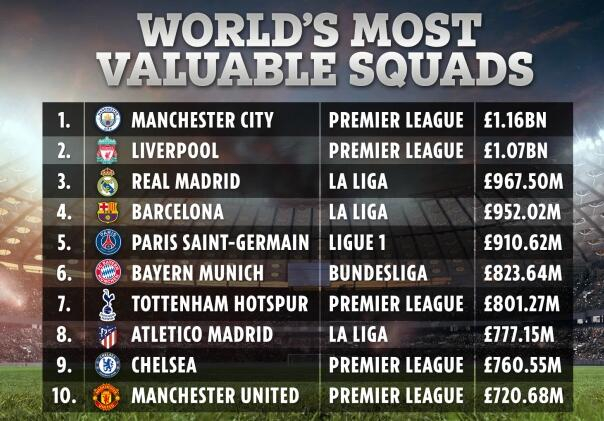 在这份阵容估价榜单上,曼城以11.6亿英镑排在第一,第二是英超新科冠军利物浦,10.7亿英镑。西甲双雄被英超两强压在了身下,皇马以9.675亿英镑排在第三,巴萨则是第四,9.5202亿英镑。