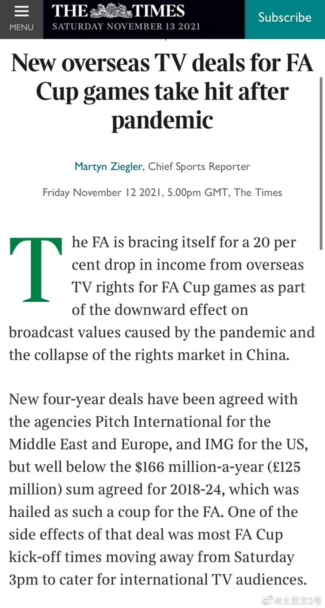 上周,泰晤士报又独家报道了足总杯版权在新的转播周期收入大幅下降20%,主要原因就是中国市场无人问津。在美国和中东尽管达成协议,但价格低于此前2018-2024赛季1.66亿美元的总额。而且为了照顾国际观众的转播需求,足总杯周六往常下午3点(英国时间)的开球时间都将被延后。意味着很多比赛都将在北京时间后半夜才能开球,这对于中国球迷来说无疑是雪上加霜。