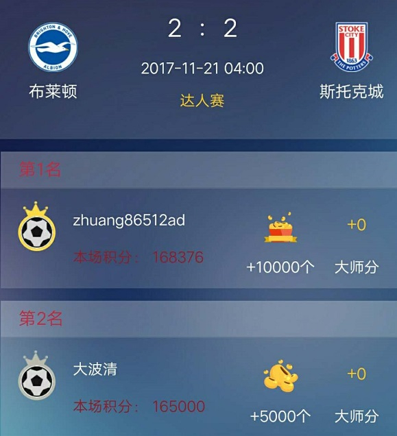 作为英超第12轮的收官之战,本场也是吸引到64位玩家报名参与。最终经过激烈角逐,一位名为“zhuang86512ad”的玩家笑到了最后。此前该玩家只是报名参加了两场达人赛,而且均未中奖。但本次他预判对了本场比赛的比分,分时段将10000积分悉数压在了“2-2”的比分选项上,进而获得了最大收益。