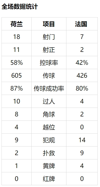上半时法国只有1次射正,队内触球数最多的马图伊迪也只有34次,只有荷兰队弗伦基-德容(68次)的一半。下半时,布林德左路传中,邓弗里斯后点距门6米处头球被洛里斯扑出,接着小角度补射又被洛里斯伸脚挡出底线。