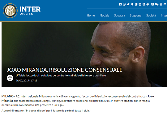 国际米兰足球俱乐部宣布,球队与若奥-米兰达达成解约协议,他将以自由身加盟江苏苏宁足球俱乐部 。这名巴西后卫于2015年加盟国际米兰,为蓝黑军团效力期间,出场121次攻入1球。俱乐部所有成员为若奥-米兰达送上最美好的祝福,祝你未来好运!