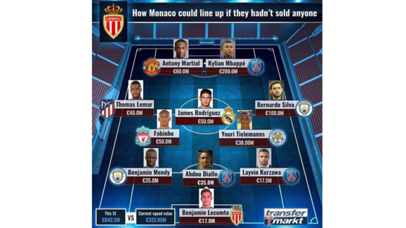 法甲的摩纳哥俱乐部是比肩阿贾克斯和葡萄牙体育的世界级“造星工厂”,在过去5年间这里走出了包括姆巴佩在内的一干超新星。德国著名足球媒体《转会市场》就整理了一套现役从摩纳哥走出的最强十一人阵容,让我看看都有谁。