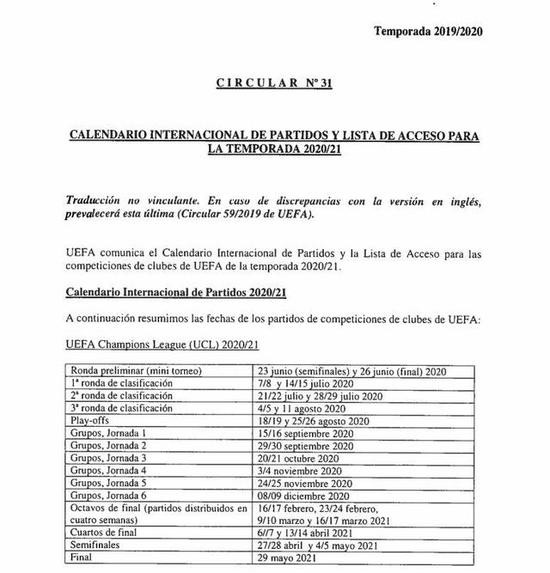 在欧足联发给各足协的2020-21赛季欧战比赛时间表中,下赛季的欧冠决赛将在2021年5月29号举行。