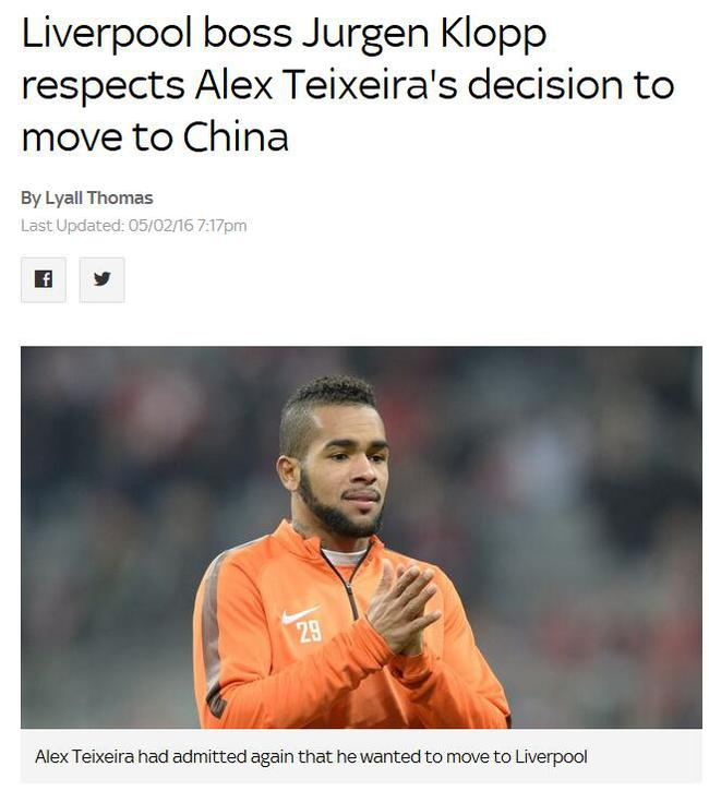 3、2016年2月,在同中超竞争特谢拉失败后,克洛普称:“近几年我听说中国人越来越有钱,尽管英超球队在电视转播合同中获得巨大收益,但也许世界足坛还有另一种力量,他们正在崛起。”