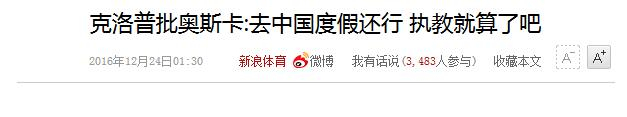 4、2016年12月,英超名将奥斯卡转投中超上海上港,克洛普被问及此事时称:“ 现在球员们都不是真的想要踢中超,唯一吸引大牌球星的方式只有靠钱,如果球员们决定去那里,你很难留得住他们。”“ 我不知道他们是怎么做出这个决定的,但我不会这样做,也许去中国度假还可以,但现在我不会去中国执教。”