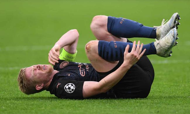 德布劳内被阿马维踩中脚面倒在禁区内,好在并无大碍。