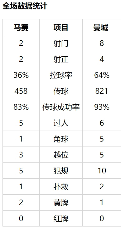 上半时马赛禁区内0射门,禁区外也只有1次打门。下半时,桑松换下龙吉耶;坎塞洛换下津琴科。斯特林右路传中,京多安禁区边缘推射被曼丹达抱住。